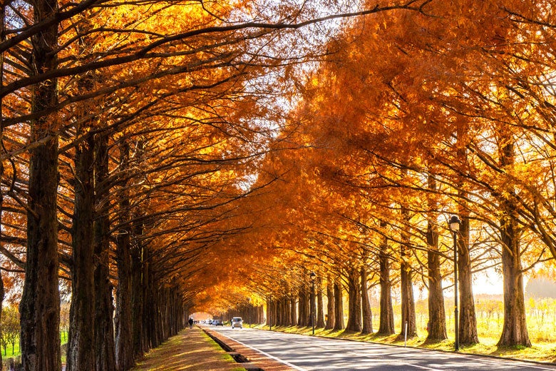 滋賀県高島市・マキノ高原のシンボル「メタセコイア並木」は、約500本が2.4kmにわたり続く圧巻の景観です。