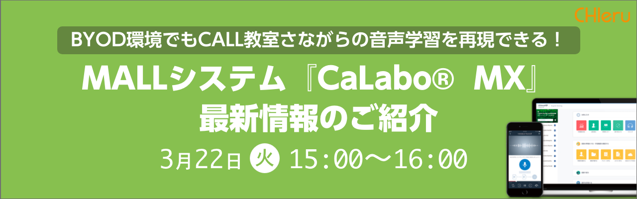 今回のアップデートにあわせて、オンラインセミナー「BYOD環境でもCALL教室さながらの音声学習を再現できる! MALLシステム『CaLabo®︎ MX』最新情報のご紹介」を開催いたします。バージョンアップ内容の詳細やオンライン授業でのMicrosoft®️ Teamsと本製品の活用方法などをご紹介します。ぜひともご参加ください。