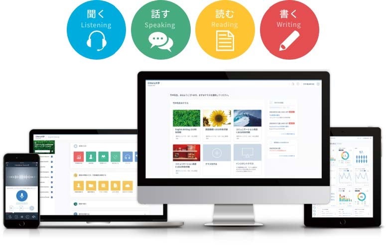 『CaLabo® MX』(以下「本製品」)は語学4技能の「聞く」「話す」「読む」「書く」に特化したクラウド型のシステムで、ノートPCやスマホなど可搬性のあるモバイル端末で利用できるのが特徴です。シャドーイングやディクテーション、語彙テストなどの授業運営に必要な機能に加え、先生に優しい操作性が授業進行をスムーズにします。