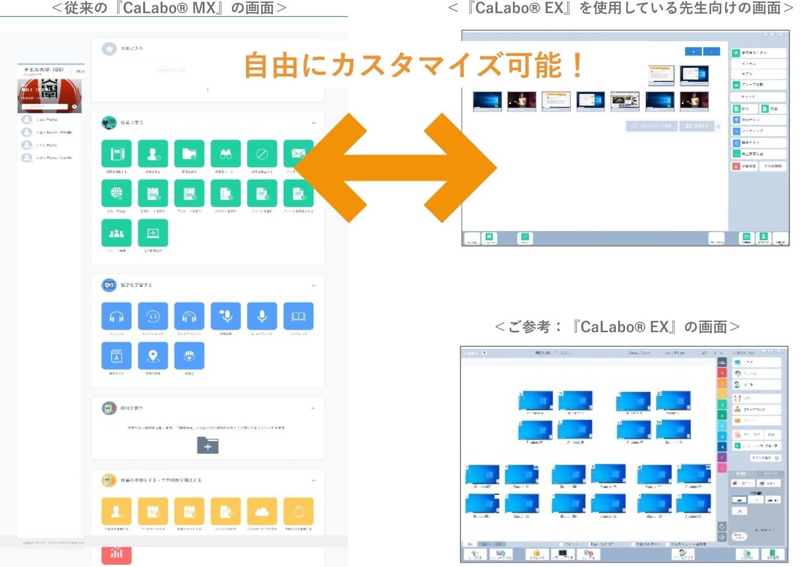 現場の先生方のリクエストを受け、従来のアイコンタイプのデスクトップ画面に加え、『CaLabo®️ EX』仕様のデスクトップ画面も選べるようになりました。長年『CaLabo®️ EX』を使用してきた先生方にとって馴染みある画面へカスタマイズすることで、これまで以上にシームレスな操作が可能です。