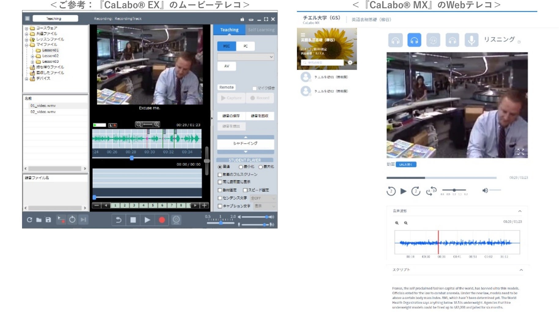 また、『CaLabo®️ EX』で好評の動画学習ツール「ムービーテレコ」の一部の機能がブラウザ上で使える「Webテレコ」の操作性も併せて改良いたしました。BYOD環境において、CALL(Computer Assisted Language Learning:コンピュータによる語学学習支援)教室さながらの音声学習が”いつでもどこでも”再現できます。