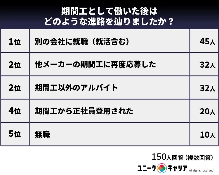 また、「別メーカーの期間工に応募した」や「期間工以外のアルバイト」という道に進む人もいることから、さまざまな道があることがわかる。
