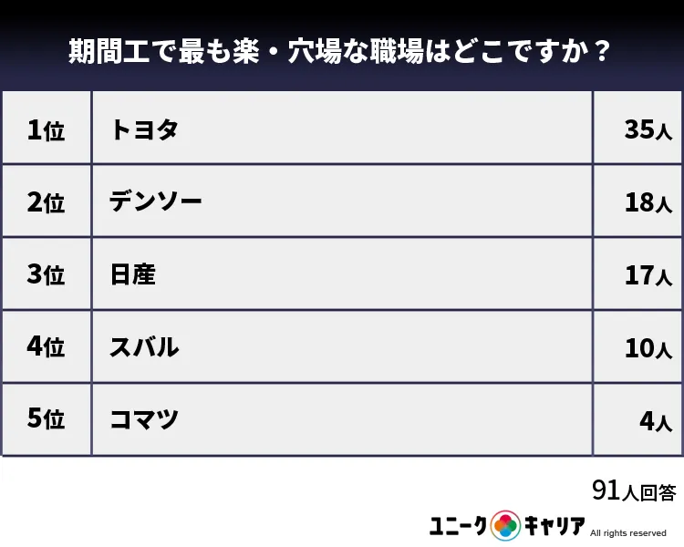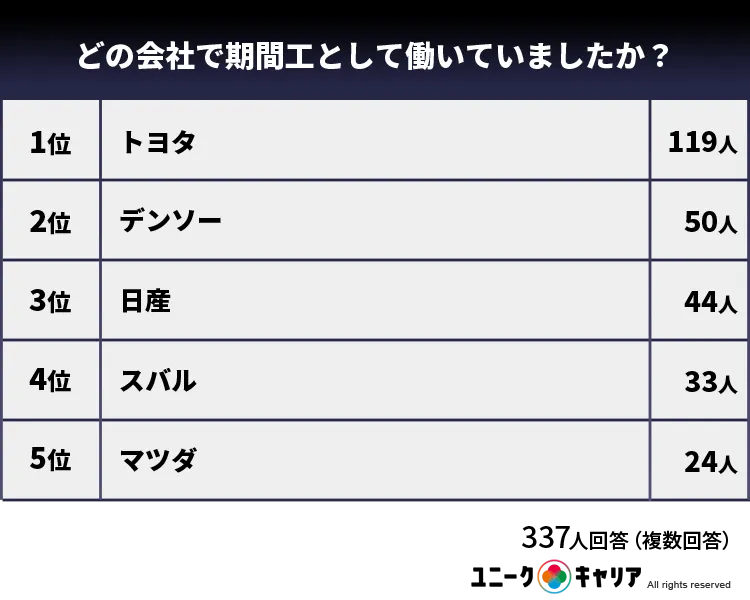 実際に期間工の経験がある人に働いていた場所を調査したところ、100人以上の人がトヨタと回答。2位のデンソーの2倍以上もの人がトヨタを選んでいることから、人気の高さがうかがえる。