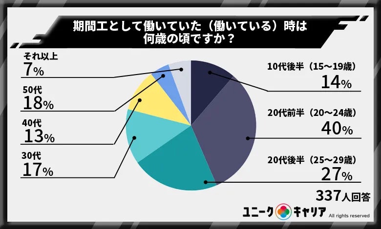 期間工として働いている(働いていた)年齢を調査したところ、67%の人が20代で経験していることが判明。