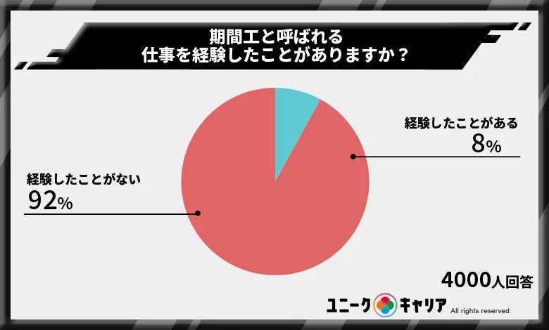期間工と呼ばれる仕事経験の有無を調査したところ、92%の人が経験したことがないと回答。このことから、期間工として働くという選択肢はまだまだマイナーであることが推測される。