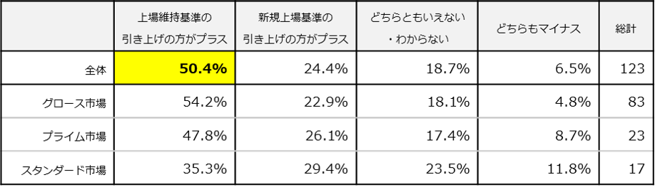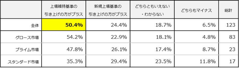 半数が上場維持基準の引き上げの方がプラスとなると回答