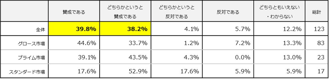 「現在の「上場10年で時価総額40億円」という上場維持基準(≒上場廃止基準)の引き上げ検討について、あなたの考えをお答えください。」という問いに対して、賛成(賛成である、どちらかというと賛成である)がおよそ5人に4人の78%に及ぶことが分かった。当事者であるグロース市場上場企業役員の賛成も78%と高い水準であった。