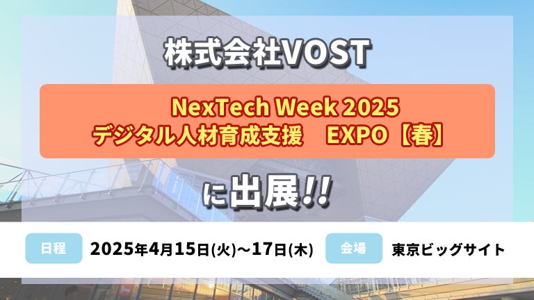 株式会社VOST(所在地:東京都江東区、代表者:別所智広)は、この度、2025年4月15日(火)~17日(木)に東京ビッグサイトで開催される「NexTech Week2025」の「デジタル人材育成支援 EXPO【春】」に出展することとなりました。