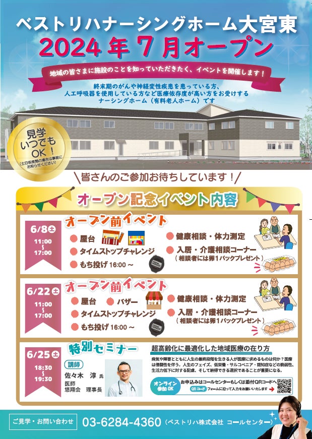 ベストリハ株式会社(東京都台東区、代表取締役社長 渡邉仁)が運営するホスピス施設(有料老人ホーム)「ベストリハナーシングホーム大宮東」が2024年7月1日(木)埼玉県さいたま市にオープンいたします。