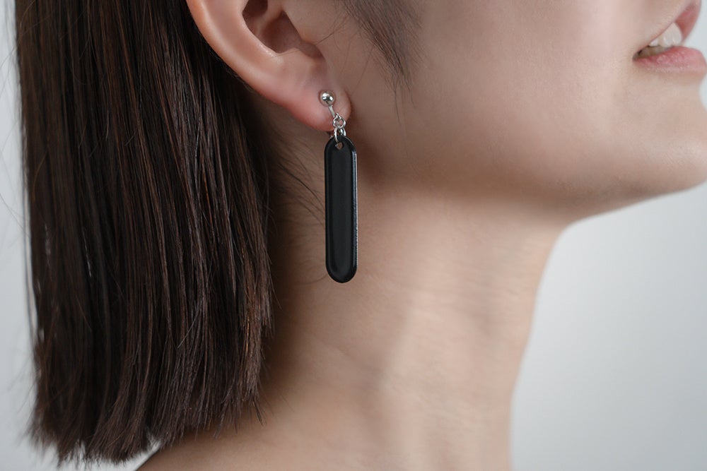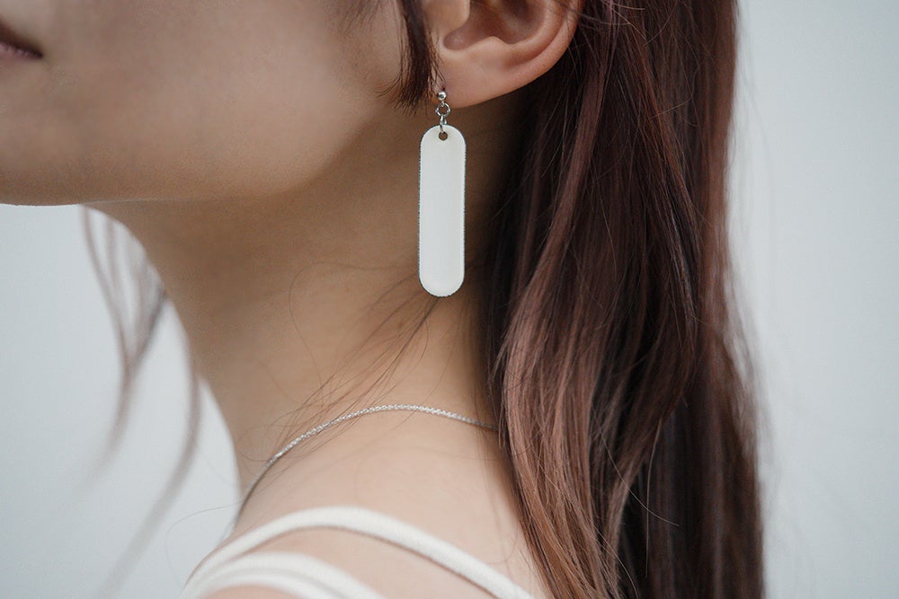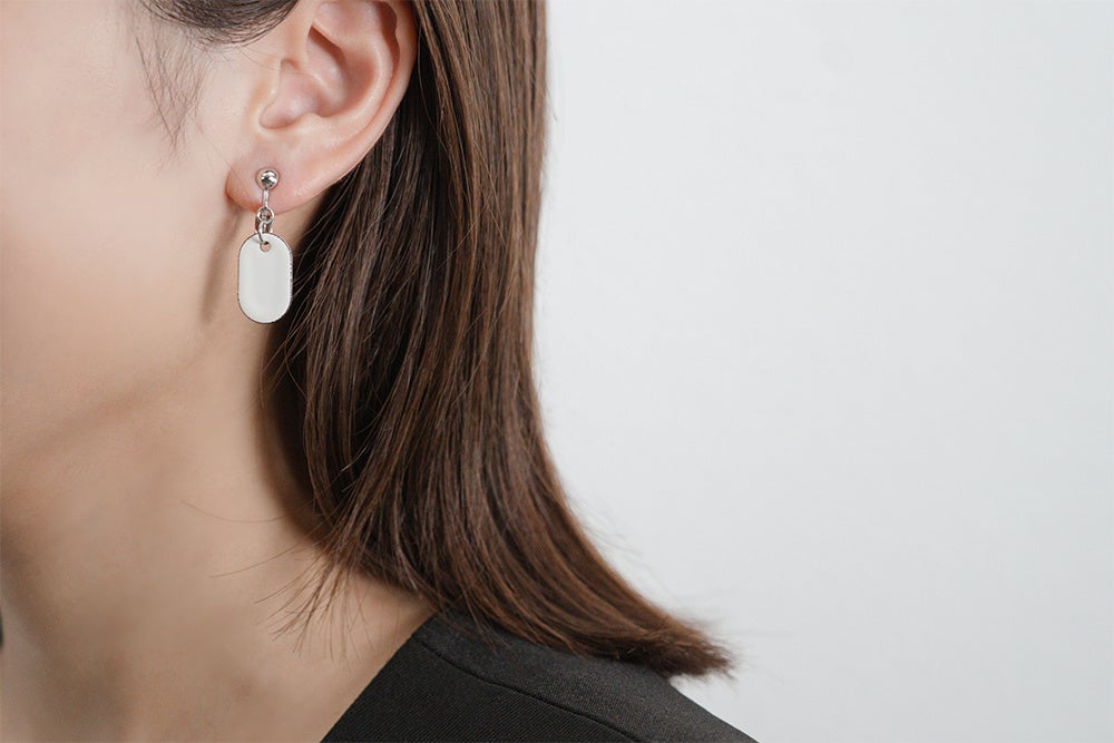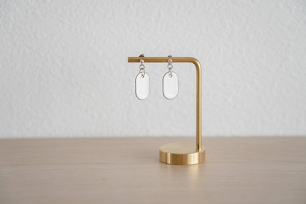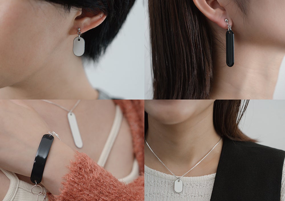 「焼き切れ」を活かし、デザインはシンプルにし、カラーはホワイトとブラックの2色展開。ピアス、イヤリング、ネックレス、ブレスレットの4種類を展開します。さらにピアス、チェーンの種類やトップ部分の琺瑯サイズで全20種類展開に。