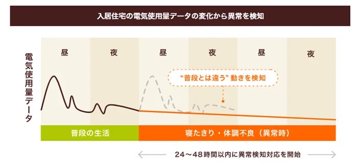 「らくもり」は、「いつもと違う」電気の使われ方を検知すると、入居者や見守り者に安否確認の連絡を行うサービスです。どの電気事業者との契約であっても利用が可能で、電気事業者の契約変更や切り替えの手間は一切不要です。
