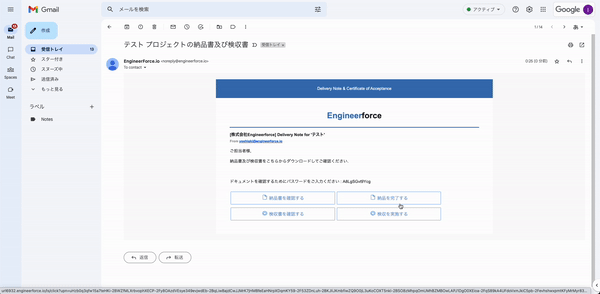 納品時もお客様へメール送付を行い、クライアントに完了ボタンを押していただき、手続きが完了します。
