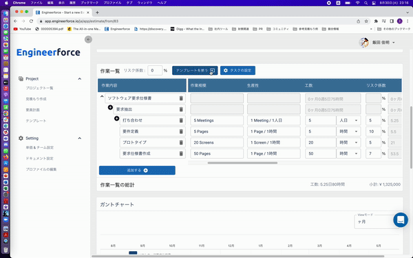 見積もりからプロジェクトマネージメントまで一気通貫で対応可能!Kanbanやガントチャートも付帯しており、収益の見える化を実現します。