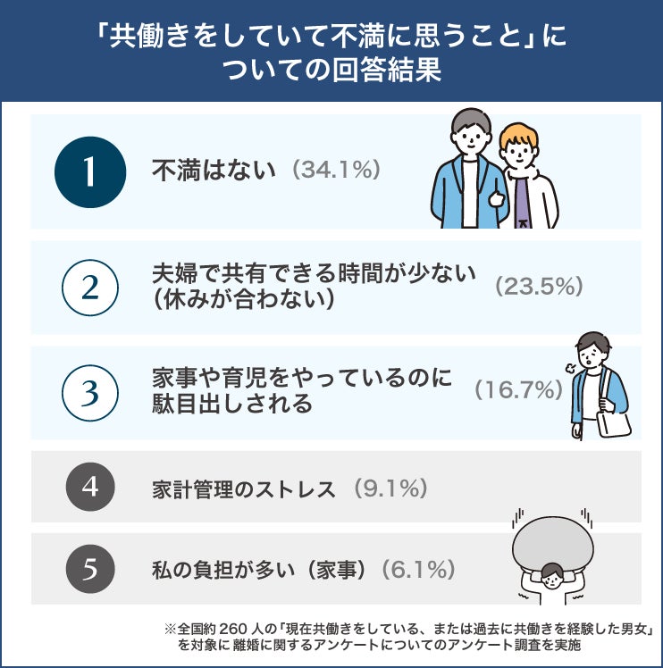 男性に共働きをしていて不満に思うことを尋ねた質問では、以下のようなランキングになりました。