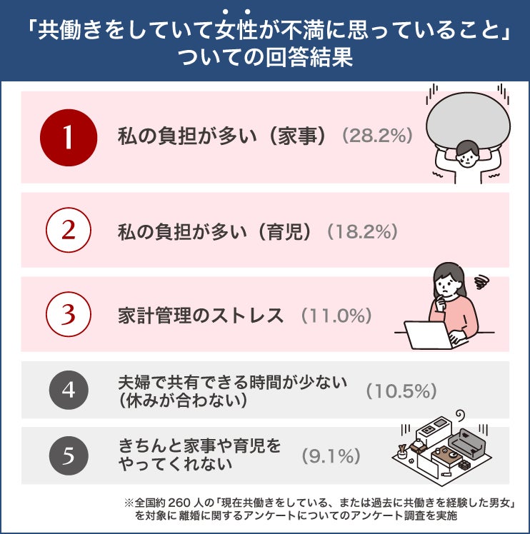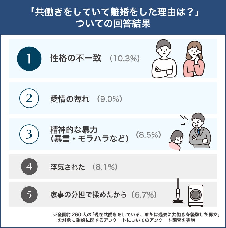 共働きをしていて離婚した方にその理由を聞いたところ、以下のようなランキングとなりました。
