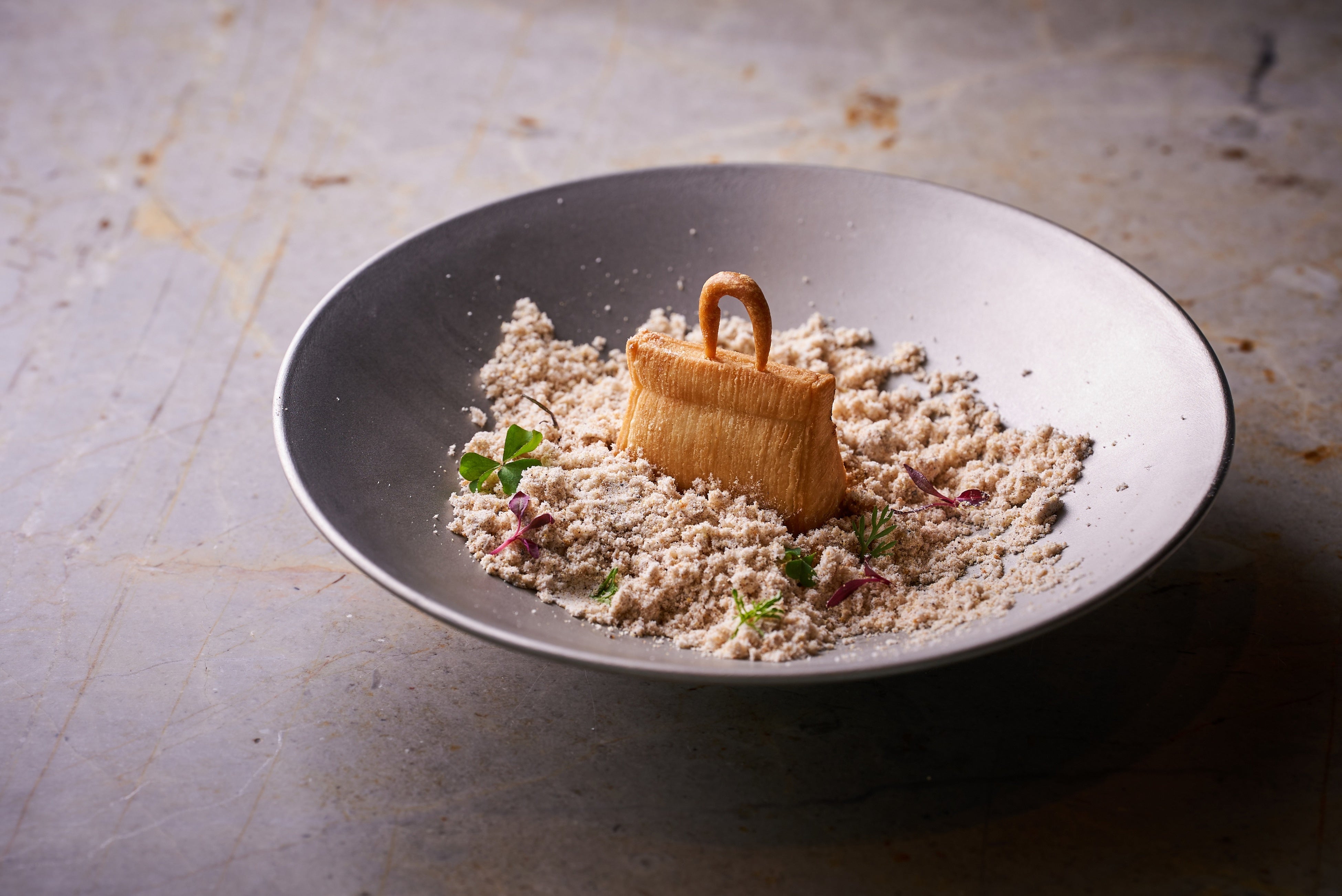 今回のコラボレーションメニューでは、ふたりの技術とユニークなアイデアをあわせ創作した「旅行中に忘れたスーツケース」、「芋角」、「鴨オールイン」を含む7品と、「タパス モラキュラーバー」の世界観を存分に満喫できる「ドーナッツ」、「遅れたクリスマスディナー」を含む6品、広東料理「センス」で人気の点心2品の、計15品で構成いたしました。「旅行中に忘れたスーツケース」は、旅の帰りに、砂浜の上に忘れてしまったスーツケースがテーマです。パリパリの生地の中にパイナップルのコンフィを詰めたサクサクの食感の飲茶に、ココナッツムースとほろ苦さでアクセントを加えたデザートに仕上げました。熟練の点心師の技と、「タパス モラキュラーバー」の「旅とアートの世界観」が合わさった一品です。