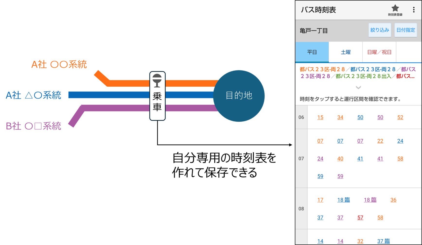 同じ方面に進む別系統や別会社のバス時刻表をまとめて確認できます。また、まとめた時刻表をお気に入り登録できます。