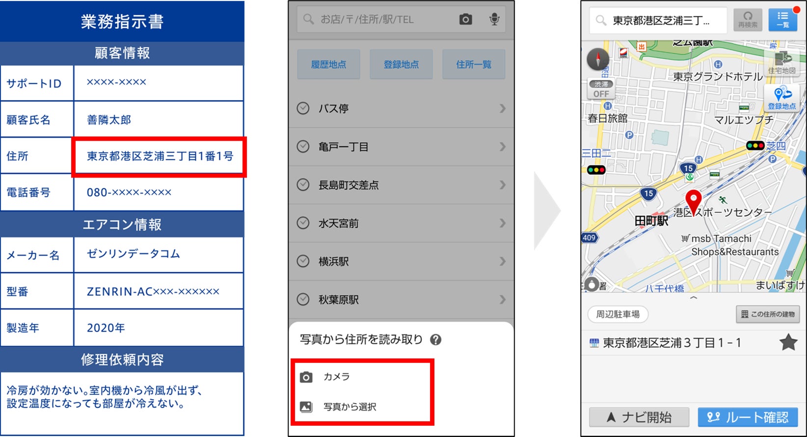 名刺や写真、業務指示書等から住所のみを判別し読み取ります。読み取った住所はそのままルート確認やナビゲーションの目的地として利用できます。長い住所を1文字ずつ入れる手間や、誤入力を防ぐことができ便利です。