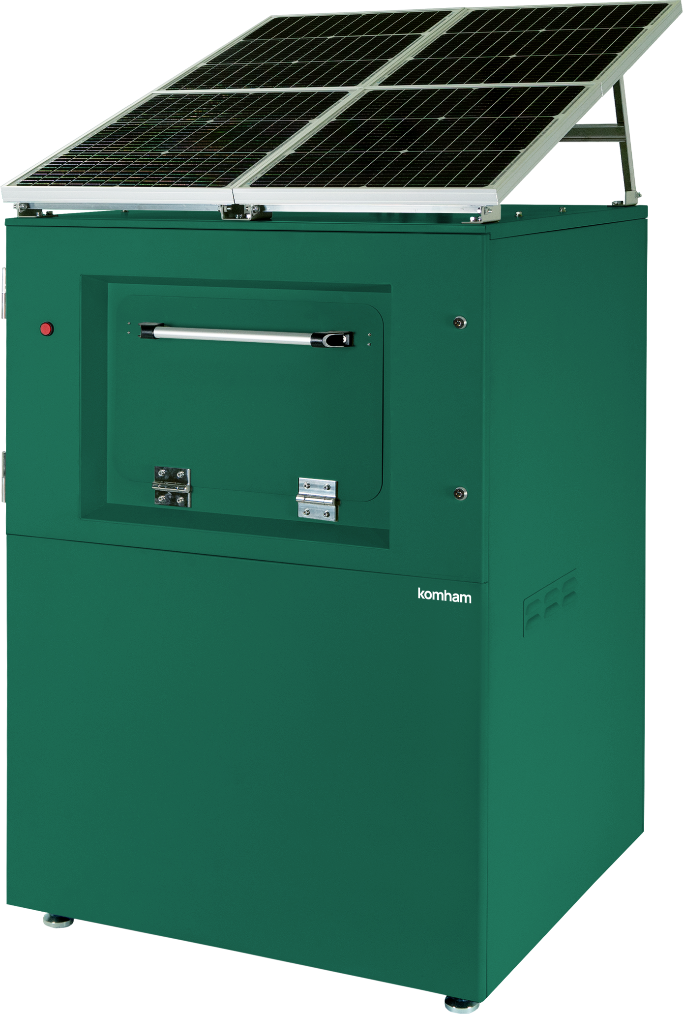 「スマートコンポスト®」は、電源・排水を必要としないソーラー発電で自動駆動する独立型の生ごみ処理システムで、当社独自の微生物群「コムハム」により、生ごみを最短1日で最大98%分解することが可能です。