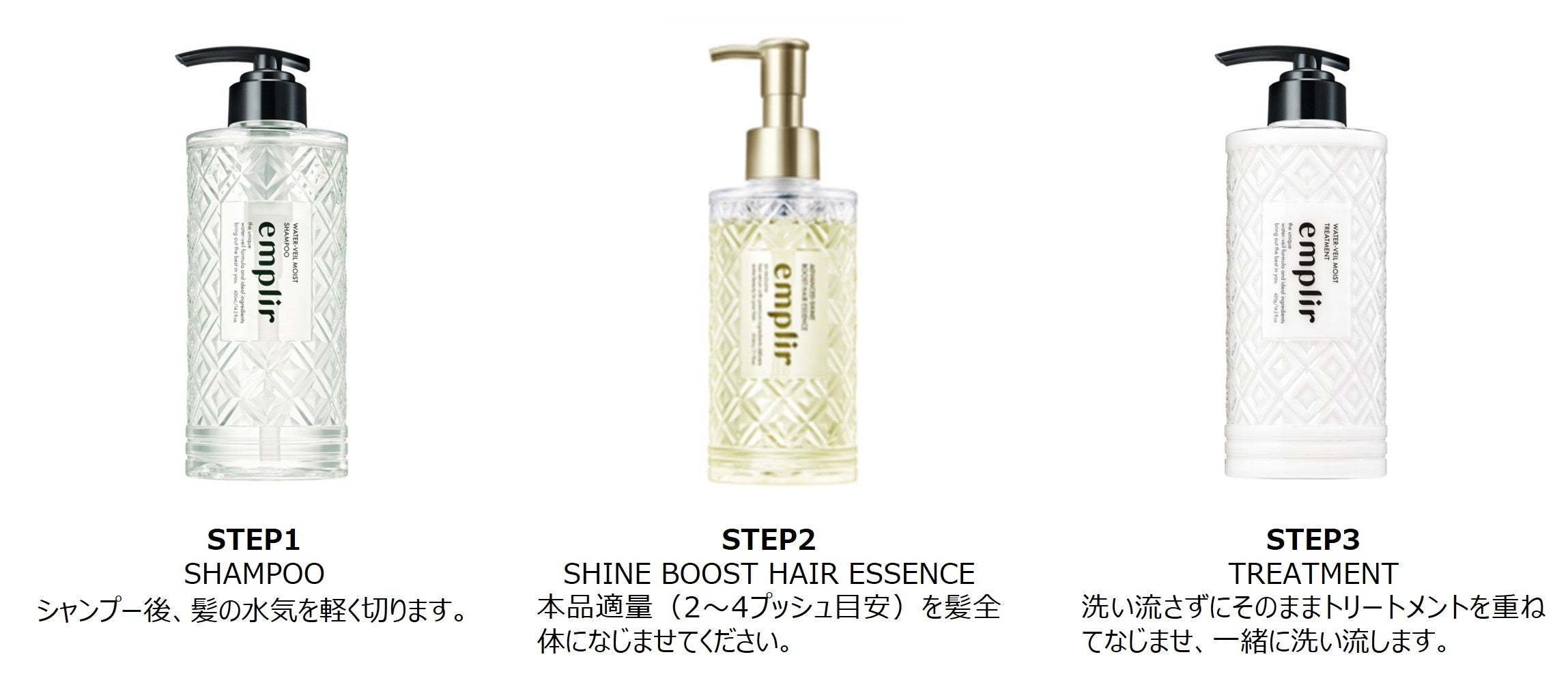 シャンプー後、軽く水気を切った髪にエッセンスを塗布し、洗い流さずにそのままトリートメントを重ね付けすることで、贅沢に配合された毛髪補修成分が浸透し、髪にうるおいを与え、ツヤのある髪に仕上げます。