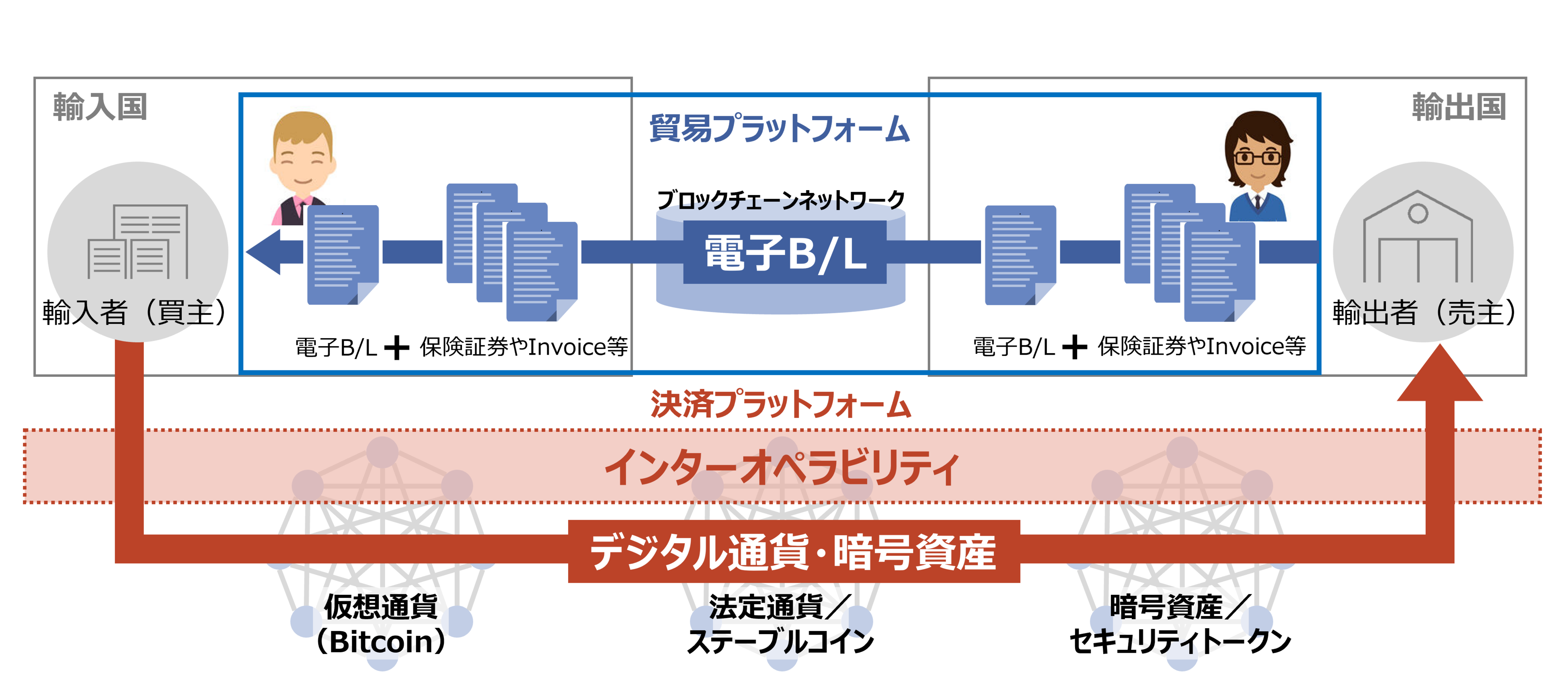 図1 電子B/Lとデジタル通貨(または暗号資産)の同時交換の流れ