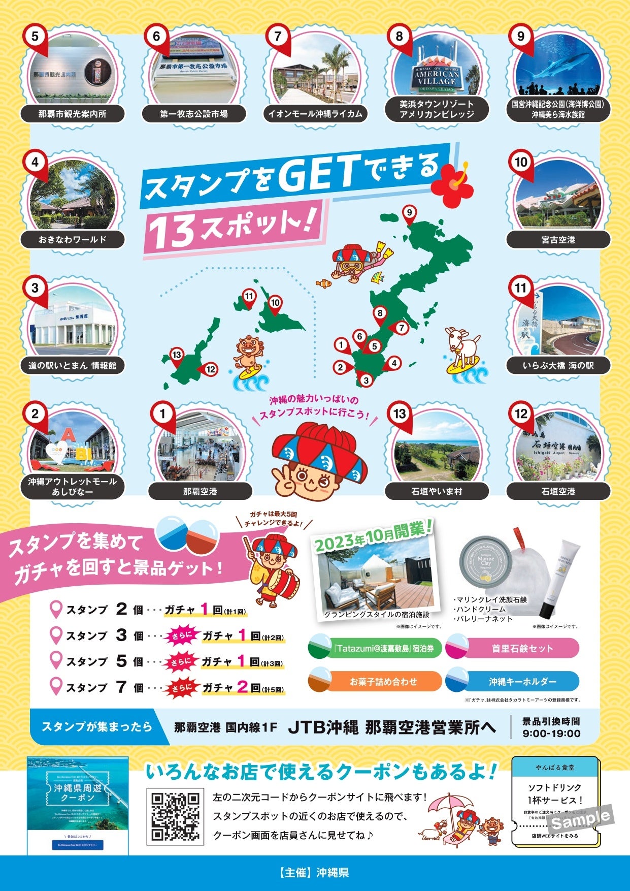 那覇空港 / 沖縄アウトレットモールあしびなー / 道の駅いとまん情報館 / おきなわワールド / 那覇市観光案内所 / 第一牧志公設市場 / イオンモール沖縄ライカム / 美浜タウンリゾートアメリカンビレッジ / 沖縄美ら海水族館 / 宮古空港 / いらぶ大橋 海の駅 / 石垣空港 / 石垣やいま村