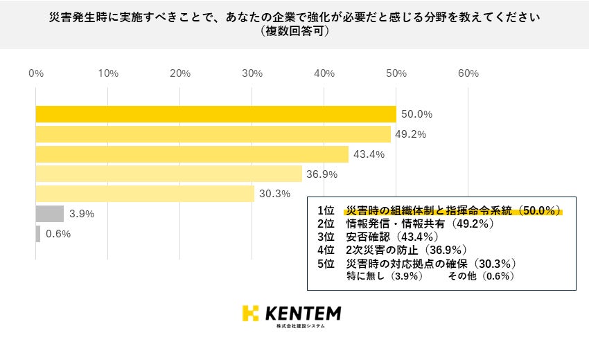 最も多い回答は「災害時の組織体制と指揮命令系統(50.0%)」でした。