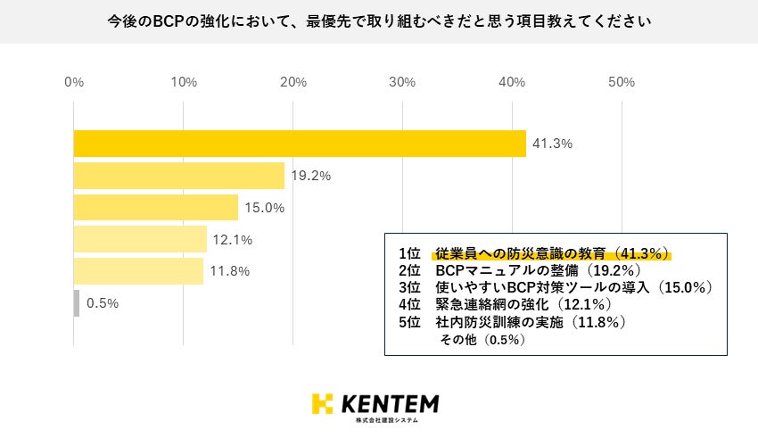 『今後のBCPの強化において、最優先で取り組むべきだと思う項目』を問う設問への回答で最も多かった回答は「従業員への防災意識の教育」で41.3%でした。