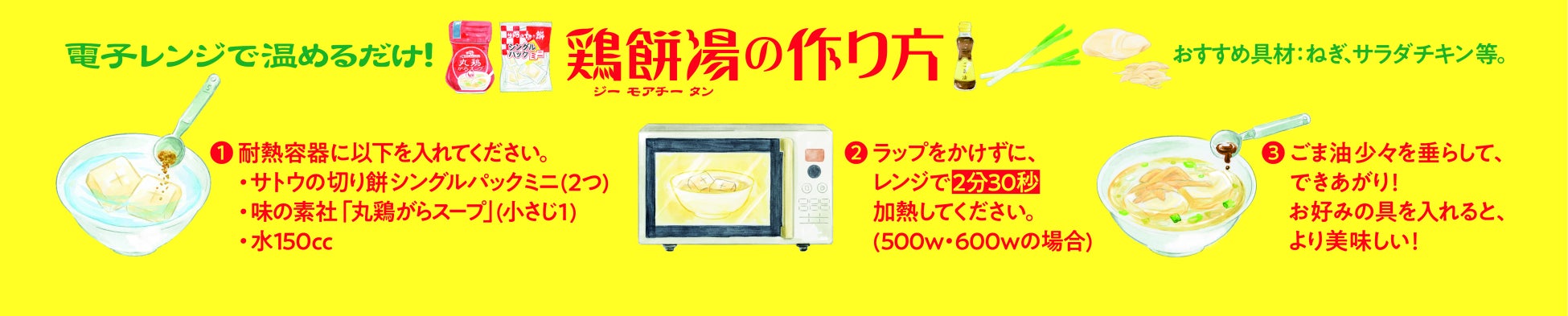 今回レシピで使用している「サトウの切り餅シングルパックミニ」は1切れ約20gとちょうど食べやすいサイズのため、レンジで調理しても従来の切り餅(50g)より短時間で調理可能となっております。調理用具や料理スキルも一切不要で「丸鶏がらスープ™」だけで味が決まる、タイパ抜群のこれから寒くなる季節にお勧めのメニューです。