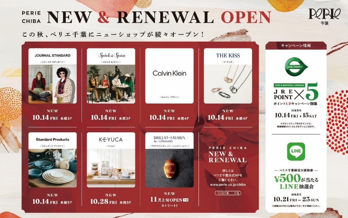 NEW OPEN を記念してJRE POINT ポイントアップキャンペーン×5や、500 円分のペリエ千葉お買物券が1,500 名さまに当たるLINE 抽選会を実施します。