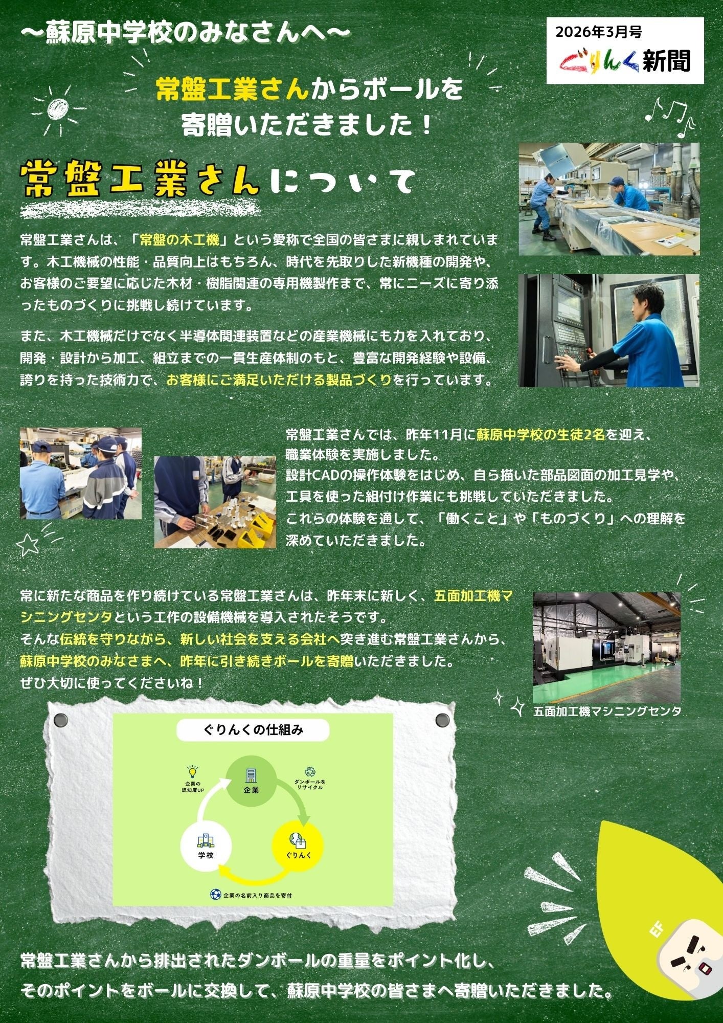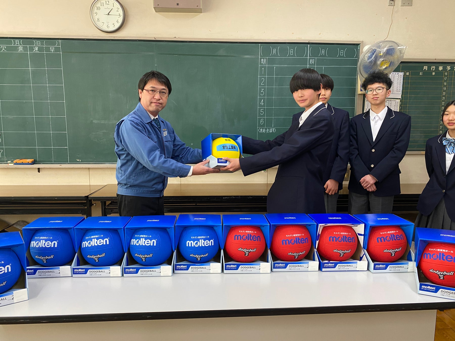 株式会社サンウエスパ(本社:岐阜県岐阜市、代表取締役:原 有匡)が推進する地域循環型プロジェクト「ぐりんく」において、参画企業である常盤工業株式会社(所在地:岐阜県各務原市、代表取締役社長:山内寛明)が、各務原市立蘇原中学校へドッジボールを寄贈し、同校にて寄贈式が行われました。