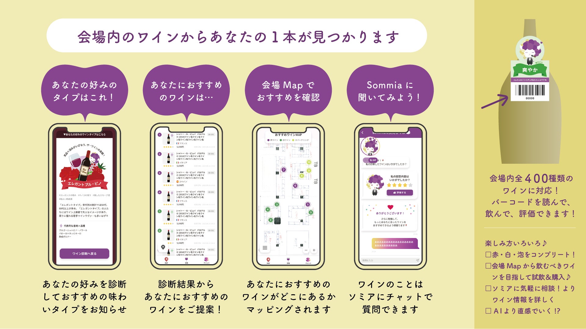開場時間:10:00~20:00 ※最終日は18:00閉場 体験内容:ソムリエAI「Sommia」によるAIワイン診断(飲み比べ・評価/パーソナライズ提案/AIチャット)