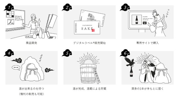 内容:唯一無二性を証明するデジタルラベル®(NFT)の発行、クリプト決済で、「蔵元リスクゼロ・先行予約システム」を可能とし、所有者が希望するときに蔵から直送するサービス