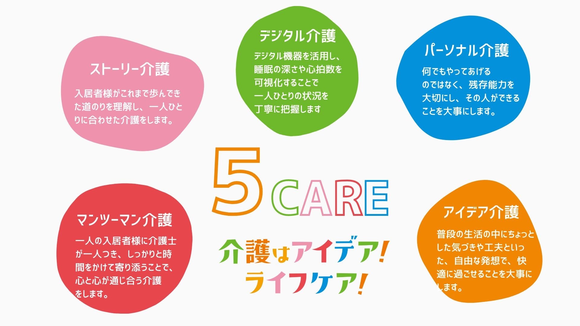 自社で行われる介護サービスを「5CARE(ファイブケア)」と定義づけています。しっかりと時間をとることや、利用者の残存機能や人生観を尊重した介護を提供しており、それらを促進するためにデジタル機器を活用したり、ちょっとしたアイデアで工夫する取り組みを尊重しています。アワードではアイデアを募集することで、介護をする側もされる側も「楽(らく・たのしく)」になるアイデアを社内に水平展開することで、経営理念でもある「ありがとう」の追求を目指しています。