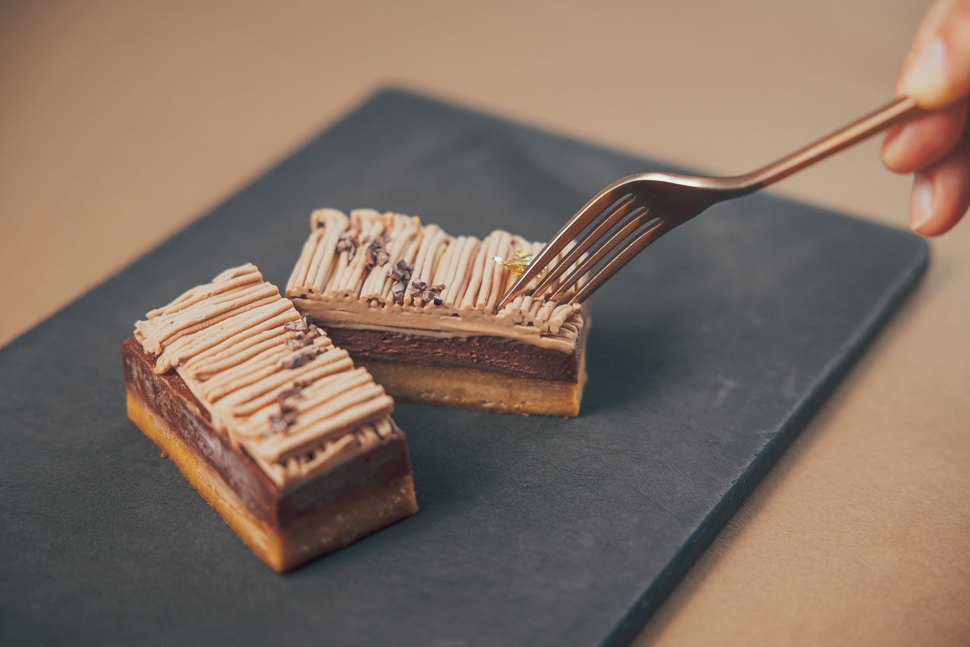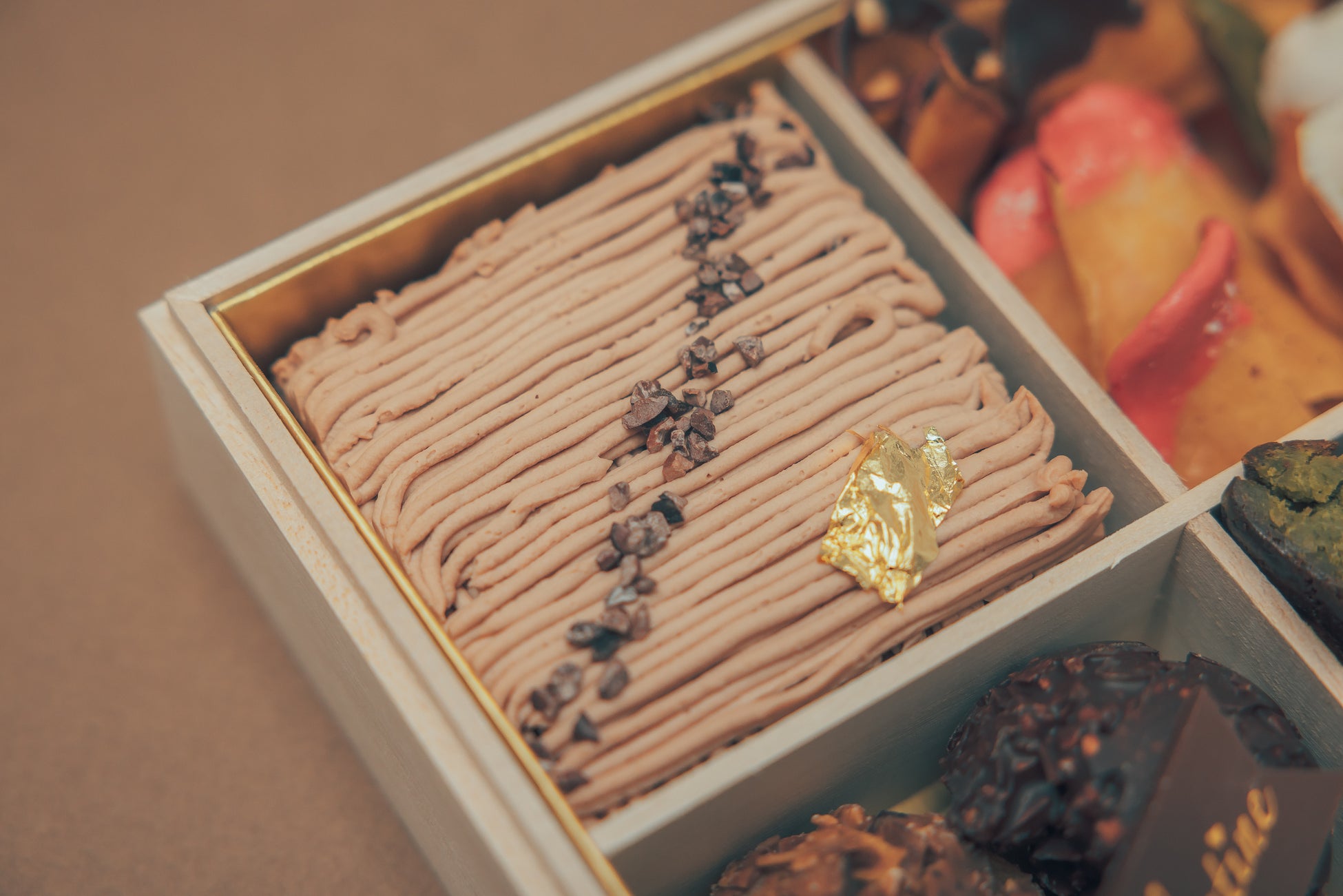 1. 蜜芋チョコレートテリーヌ:このバレンタイン限定の『蜜芋尽くしのスイーツお重箱』のために作られた、蜜芋ペーストとチョコレートの特別なハーモニー。クリーミーな口どけと上質な甘さが特徴で、コーヒーや紅茶にもぴったり。もちろん上白糖不使用、グルテンフリーのケーキです。