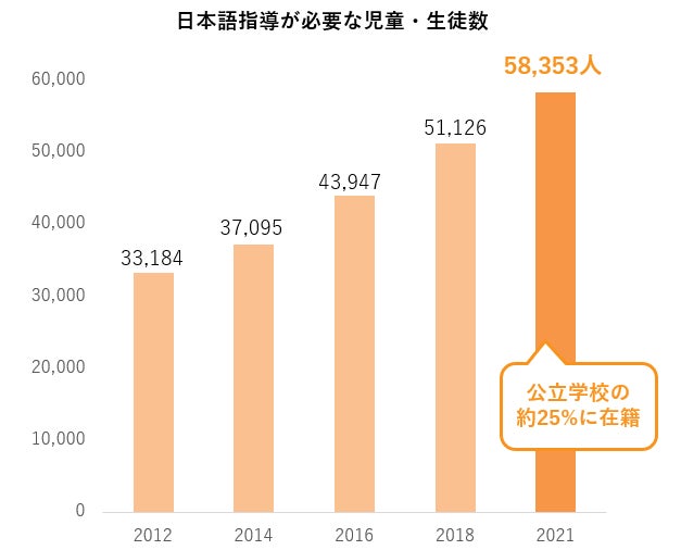 海外から日本に帰国した、外国で生まれて日本に来た、日本生まれだが保護者の母語が日本語ではない等の理由から、日本の学校においても、日本語の支援を必要としている子どもたちがいます。文部科学省の調査では「日本語指導が必要な児童生徒」は年々増加し、2021年度には約5.8万人に達しています。こうした子どもたちの支援の多くは、自治体や学校、地域の市民団体等に担われていますが、地域による支援体制のばらつきも大きく、子どもたちは授業や学校生活の中で、つまずきを抱えてしまうことがあります。