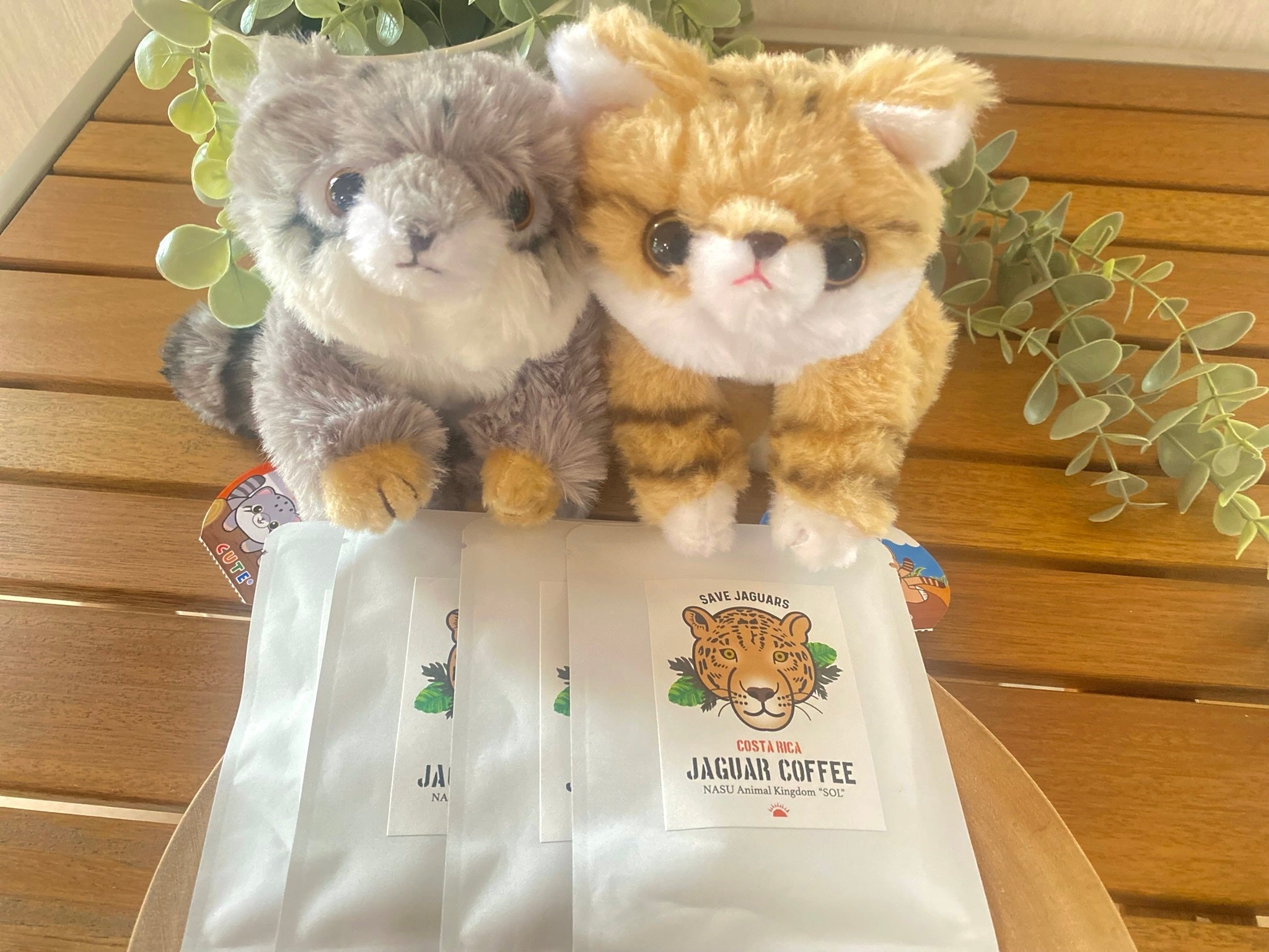 コンセプトルームにご宿泊いただいたお客様には、那須どうぶつ王国公式グッズの「スナネコ」または「マヌルネコ」のぬいぐるみと、「ジャガーコーヒー」を一人一個プレゼントいたします。「ジャガーコーヒー」はコスタリカに生息する絶滅危惧種のジャガーを保護するためのプロジェクトで、このコーヒーを飲むことで私たちもジャガーを守る活動に貢献できます。