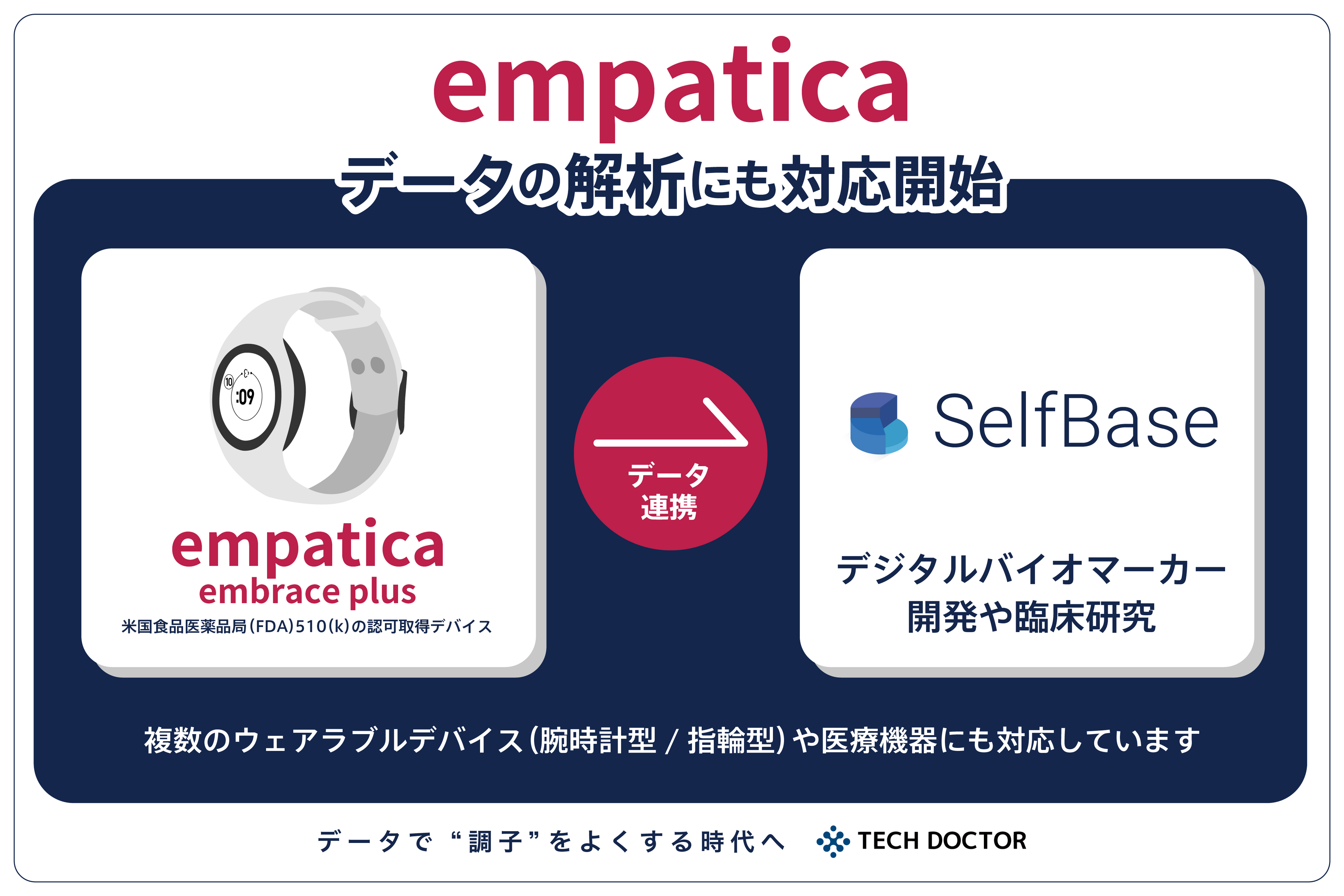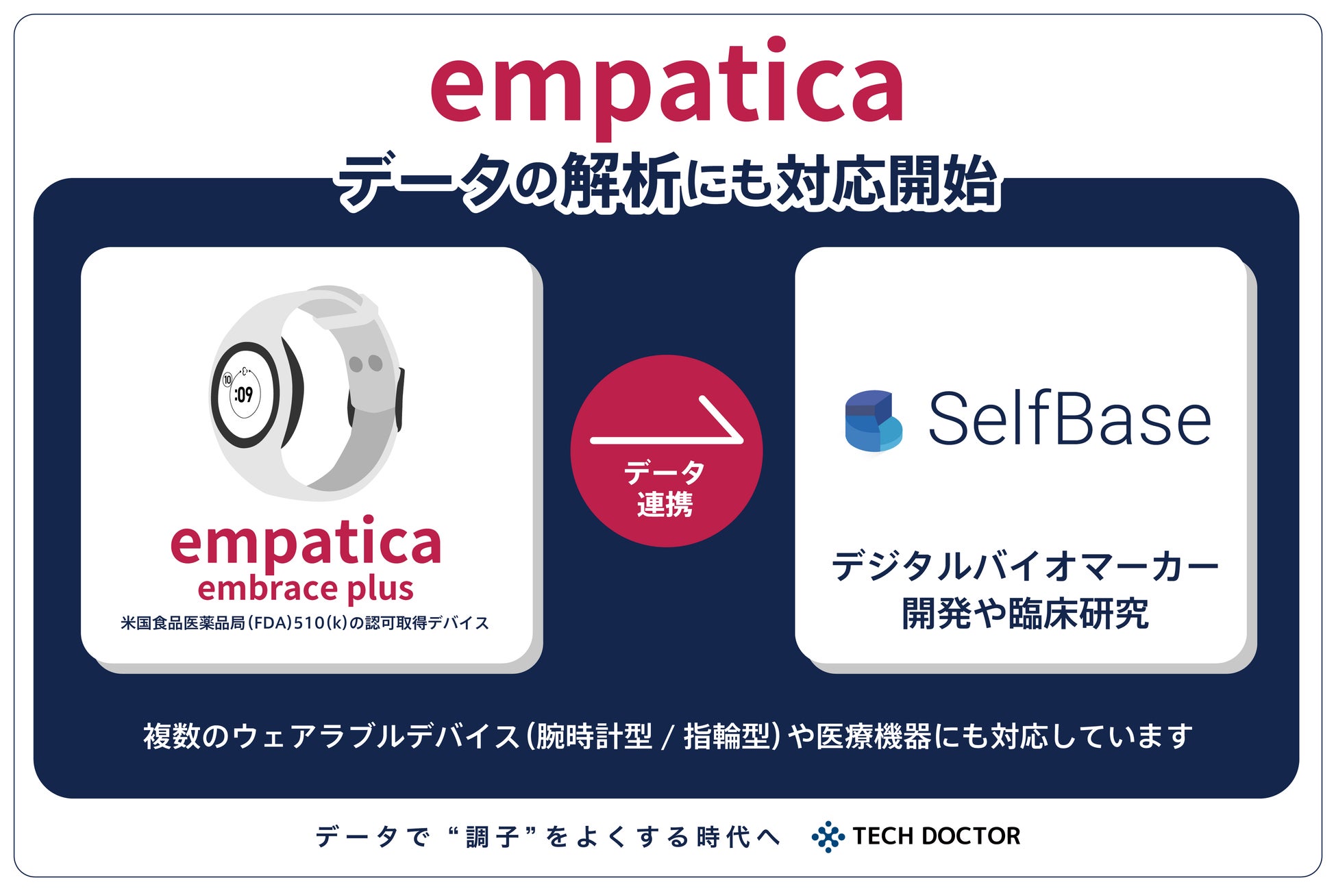 株式会社テックドクターは、"データで調子をよくする時代へ"をビジョンに掲げ、医療・製薬・食品関連企業や研究機関向けのデジタルバイオマーカー開発プラットフォーム「SelfBase」を展開しております。