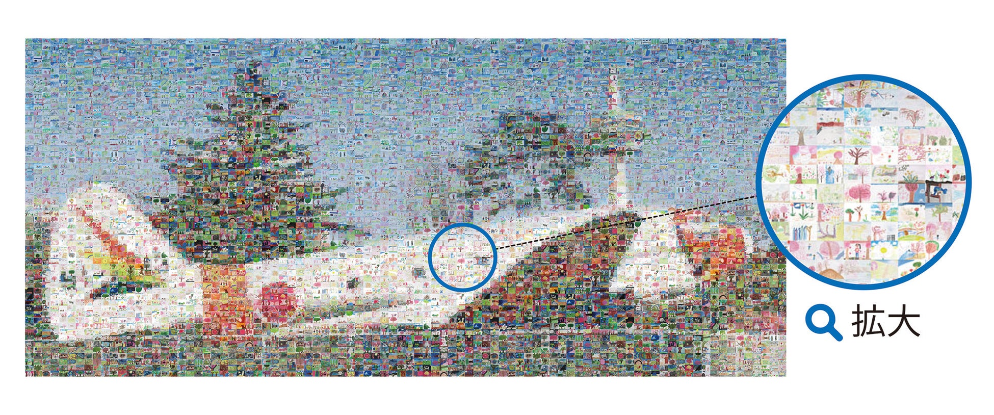 限られたスペースの中でより多くの子どもたちの絵が掲出できる方法を模索した結果、約1000枚の絵で一つの大きな絵を織りなすモザイクアートでの展示へと至りました。モザイクアートを形作る1枚1枚のフォトパーツは小さいものですが、協力して大きな1つの作品を作り上げることで、これから具体的な進路を検討する子どもたちが所沢市への親しみを深めてもらえればと願っております。