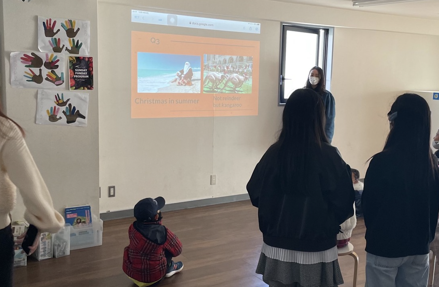 「クリスマスってどんな日?」「世界のクリスマスはどんな感じなんだろう?」「クリスマスをテーマにした映画や歌は何があるんだろう?」こうした疑問に英語でクイズ形式で答えていきました!子供たちは積極的に答えを出したり、リズムに乗りながら音楽を聞いたり、とても楽しく、クリスマスについて学びました。