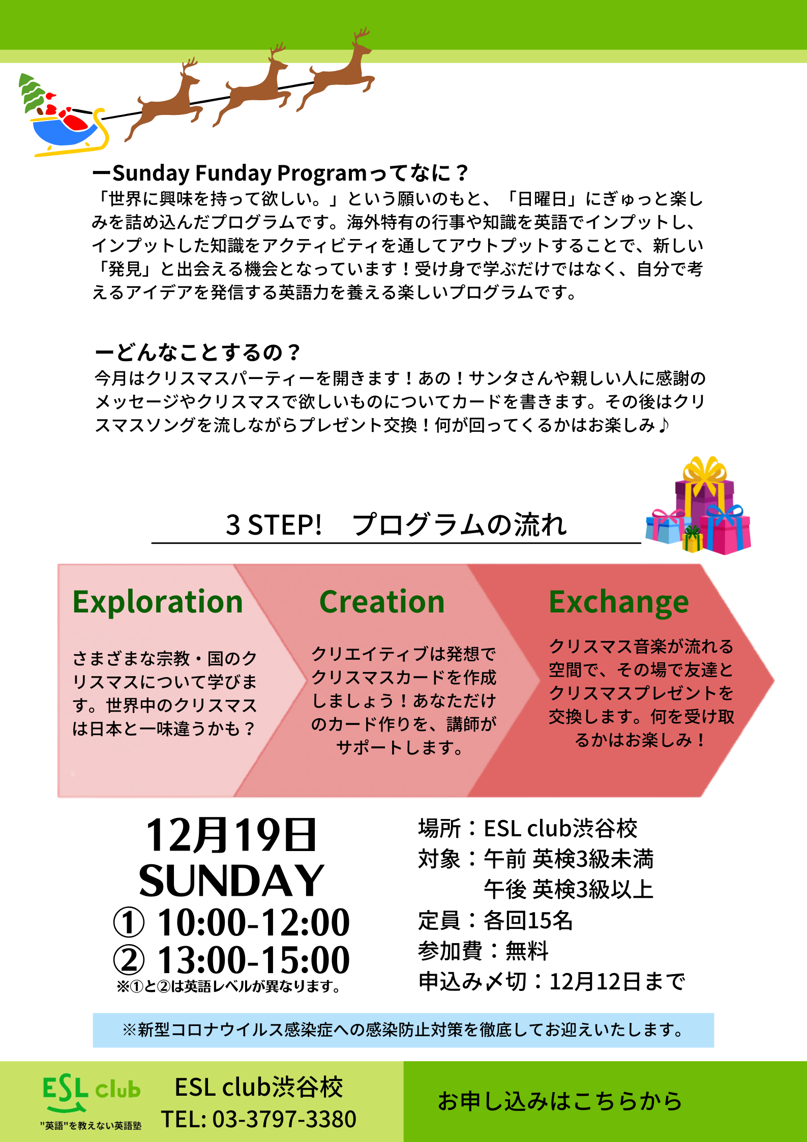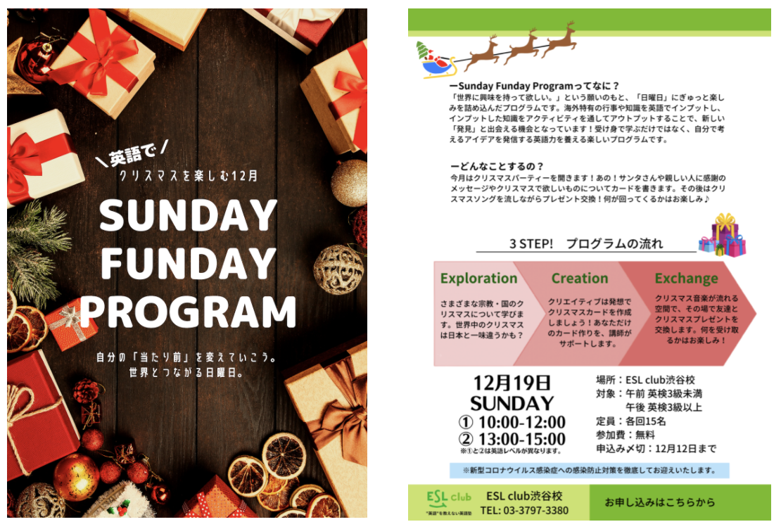 「“英語”を教えない英語塾」ESL club (本社:株式会社明光ネットワークジャパン 東京都新宿区西新宿7丁目20番1号、代表取締役社長:山下 一仁 )は、子どもの英語の学習意欲を引き出すイベント”Sunday Funday Program”を開始し、2021年12月19日(日)渋谷校にてクリスマスイベントを開催いたしました。