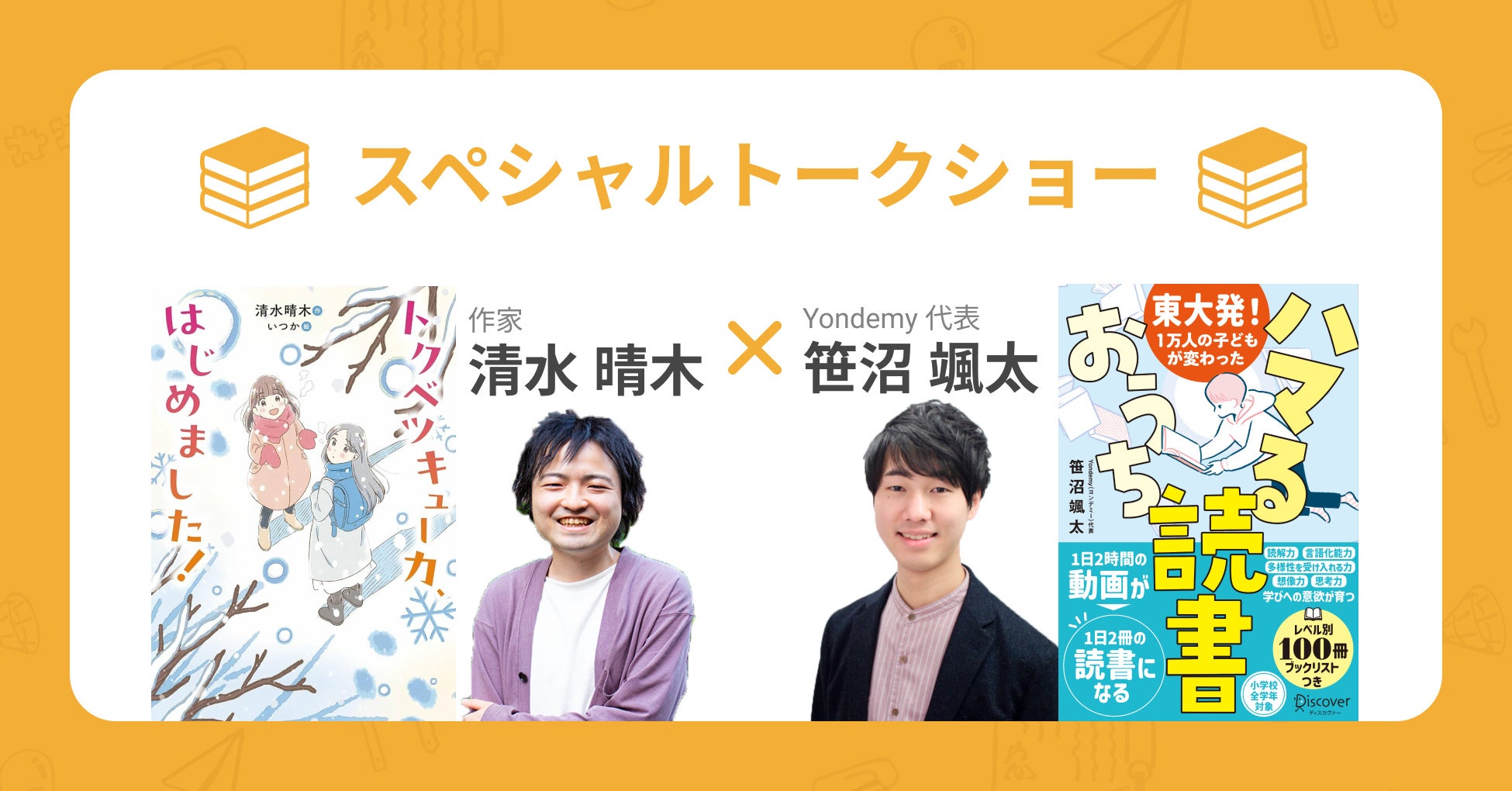 子どもが読書にハマるオンライン習い事「ヨンデミー」を運営する株式会社Yondemy(本社:東京都中央区、代表取締役:笹沼 颯太)は、大垣書店とのコラボ企画として、作家・清水晴木との小学生向けワークショップを2024/7/27(土)に大垣書店麻布台ヒルズ店で開催いたします。 動画世代の子どもたちの本選びをサポートするYouTube「ヨンデミーちゃんねる」開設記念として、子どもたちがより本を読むのが好きになるようなワークショップ、そして清水晴木と笹沼颯太の対談イベントを実施いたします。 つきましては、本イベントの参加申し込みの募集を、受付開始いたします。