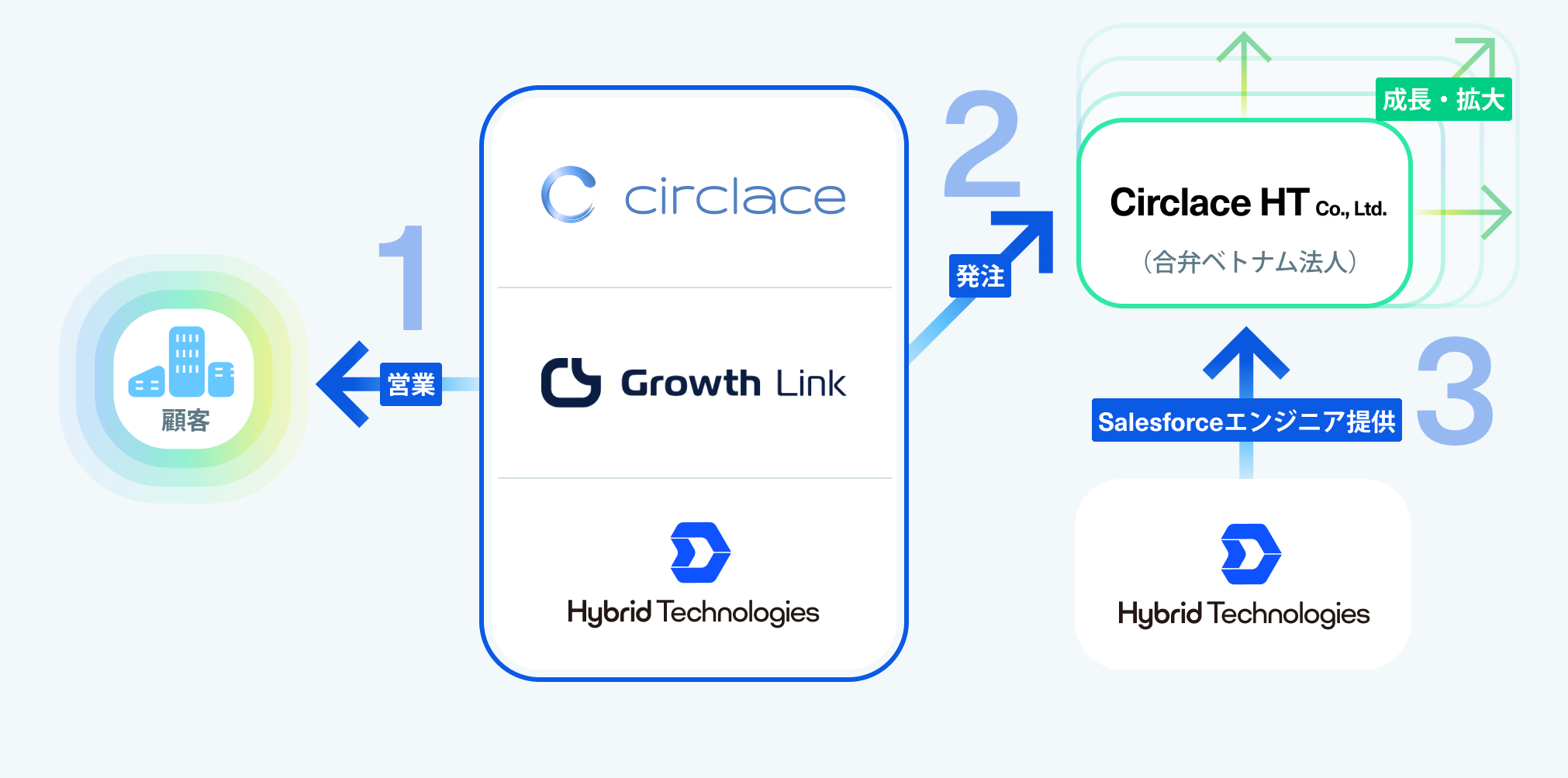 当社とハイブリッドテクノロジーズおよびグロースリンクがタッグを組むことにより、Salesforce製品群に関する豊富な知見と潤沢な専門人材の供給というシナジーが生まれ、グローバル展開も含めた強固なサービス提供体制の構築が期待されます。今後、この体制により、100名以上のIT人材を擁する体制の構築を目指してまいります。