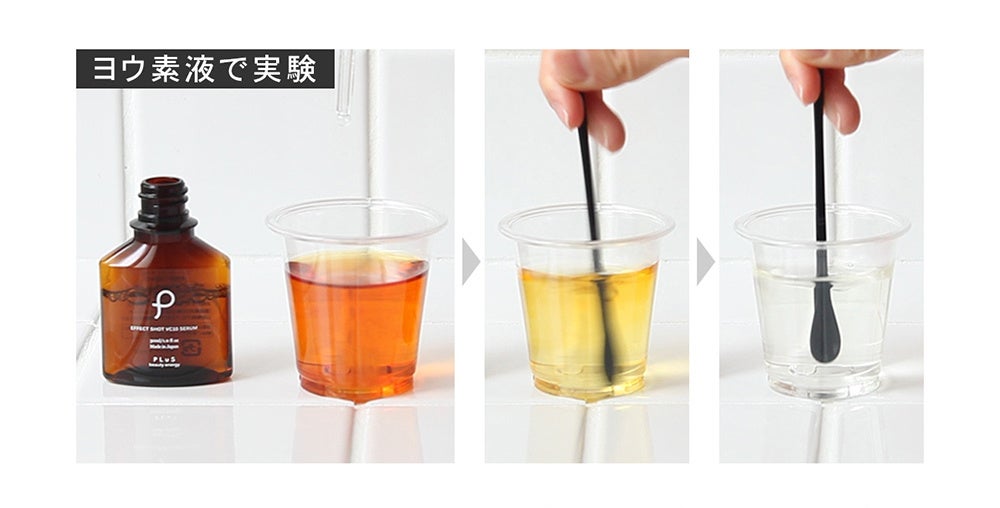 エフェクトショット VC10セラムを加えるとビタミンCの影響でヨウ素(茶色)が還元されて、ヨウ素イオン(無色)に変化します。