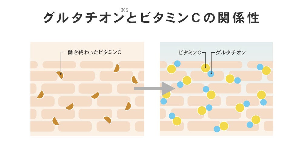 また、グルタチオン(※5)の最大の魅力はビタミンCとの関係性です。肌の中で働き終わったビタミンCをもとの元気な状態に戻す特徴があり、共同作業をしながら肌にアプローチし続けます。