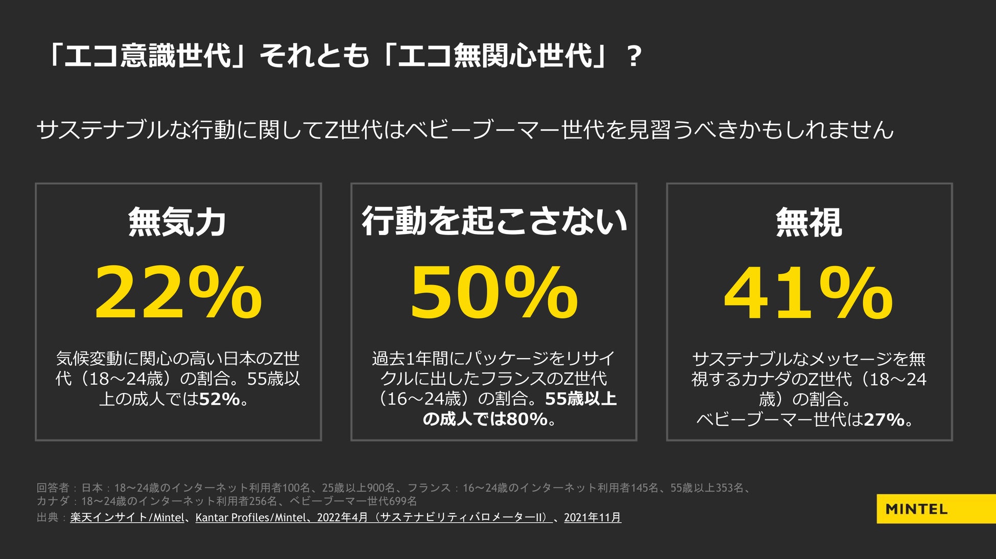 スウェーデンのZ世代であるグレタ・トゥーンベリさんの国連での主張をきっかけに、気候危機への対策を求める「未来のための金曜日」活動が日本でも起こりましたが、気候変動に関心の高い日本のZ世代(18~24歳)はわずか22%(55歳以上では52%)、過去1年間にパッケージをリサイクルに出したフランスのZ世代(16~24歳)は50%(55歳以上では80%)、サステナブルなメッセージを無視するカナダのZ世代(18~24歳)は41%(ベビーブーマー世代は27%)という数値になっています。