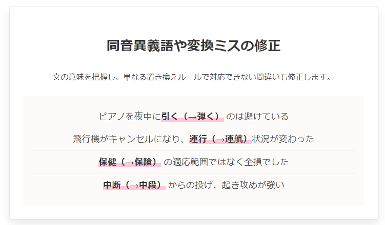 変換ミス、誤字脱字や二重敬語のチェックの他にも、文の長さや表記ゆれの統一、文中に含まれる単語の分析などが可能です。