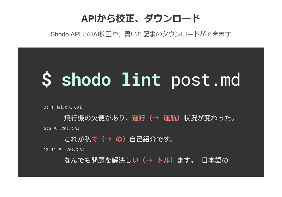 またShodoはお客様のシステムと連携して文章を校正するAPIも提供しています。すでにメディアサイトや編成システムを運営している場合に、Shodoと連携するだけでAIによる指摘や表記ゆれのチェックを受けられます。