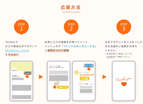 かどや製油のTwitter公式アカウント(@kadoya_seiyu)にて、かどや社員による「純正ごま油」とのエピソードを発信しております。是非、お気に入りの物語を探してみてください。ご感想を添えて引用リツイートいただいた方の中から抽選で55名様にかどやの「純正ごま油」をプレゼント。