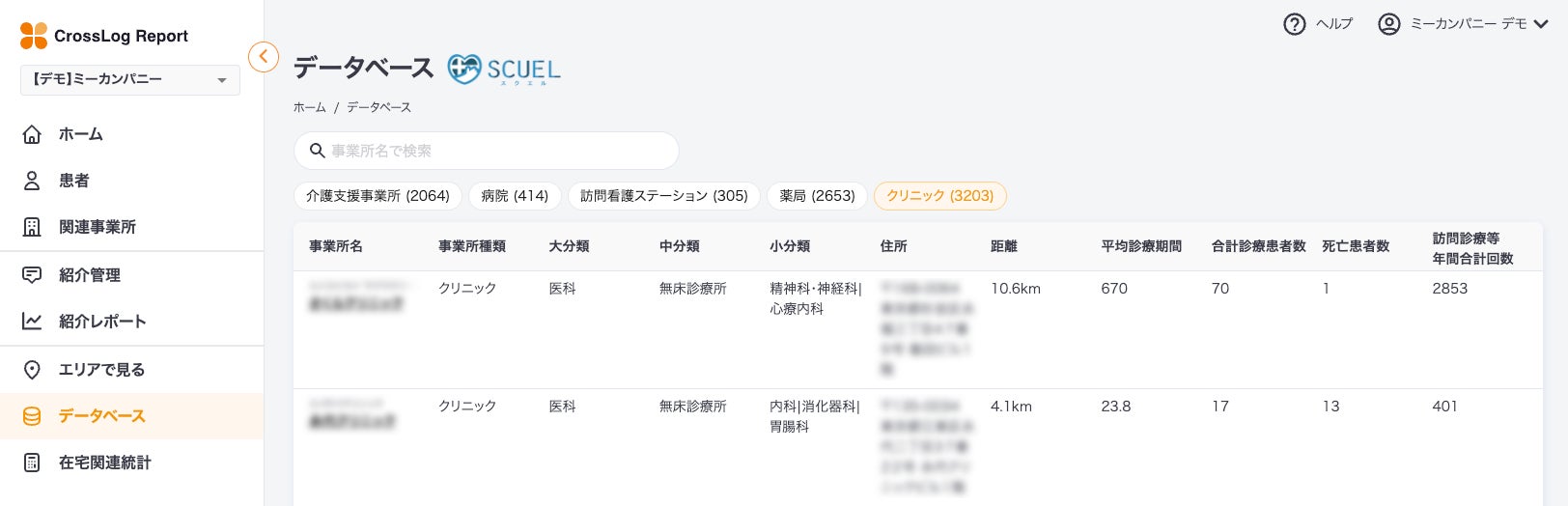 SCUELが保有する在宅患者数データ(訪問件数・平均診療期間・死亡数等)をCrossLog Reportに実装しました。地域内の他院と自院の実績を比較しながら、訪問エリアの戦略立案や診療効率の改善に活用できます。